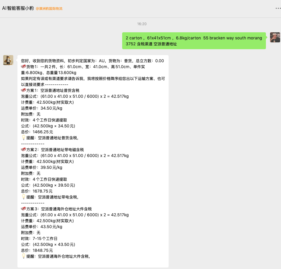 微信机器人采用自然语言处理技术,能够智能识别客户的询价意图。当客户发送诸如"深圳到纽约空运价格"这样的询问时,机器人会自动识别起始地、目的地和运输方式,并从系统中查询最新报价信息,实时回复给客户。