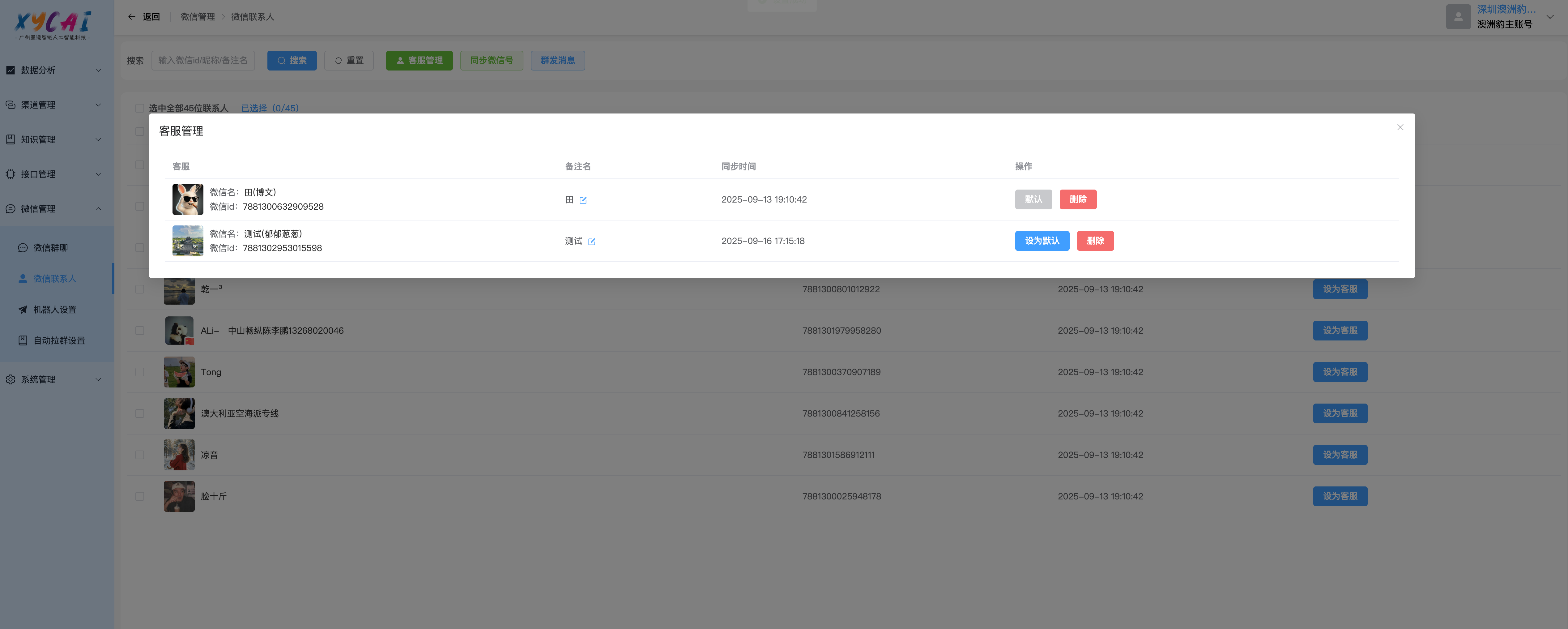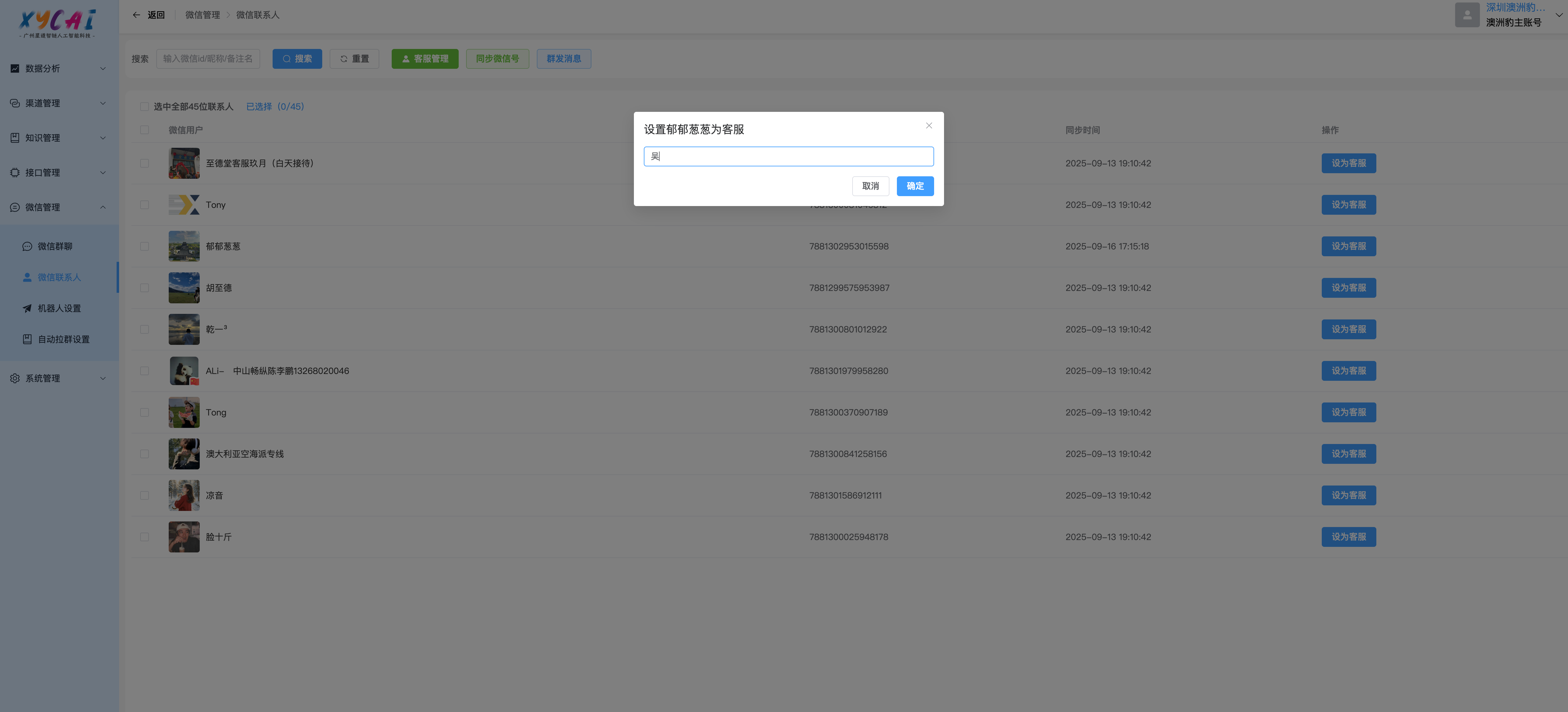 待我司技术人员配置对接微信后。在本页面点击同步微信号按钮可以列出所有机器人的好友