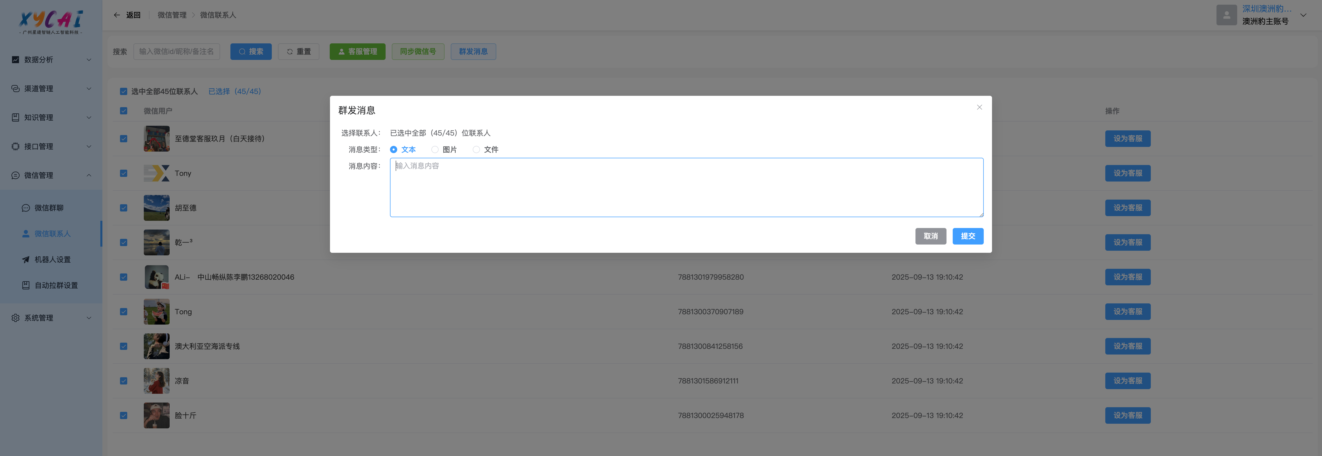群发消息:可在群列表前选中要群发的联系人,然后点击 上方 群发消息 按钮进行群发,群发内容包括文字、文件、图片