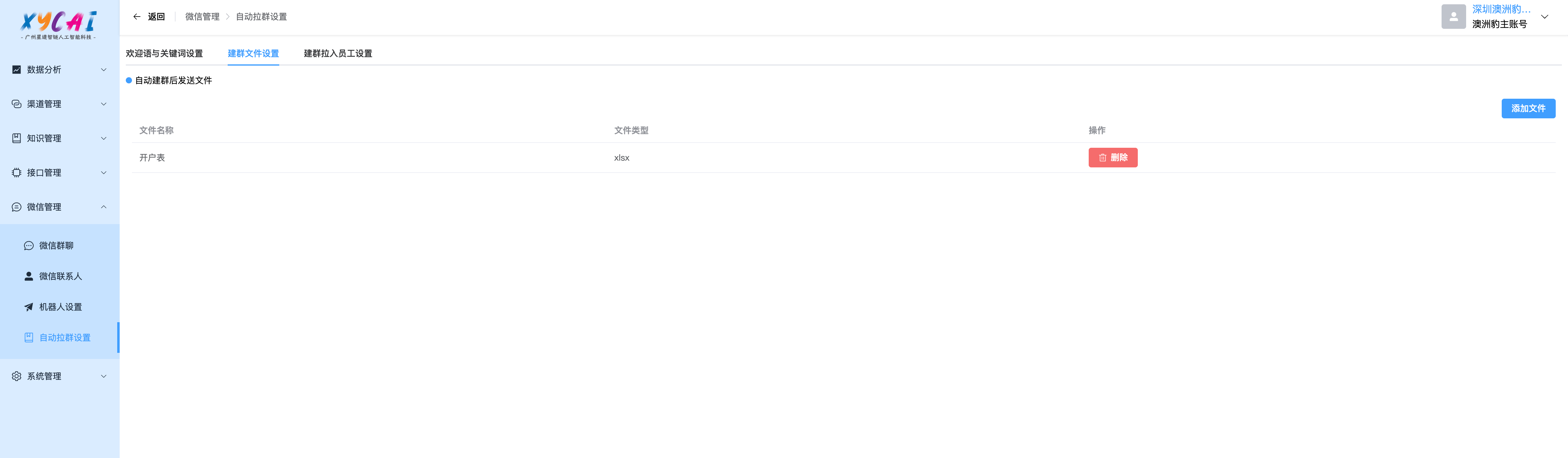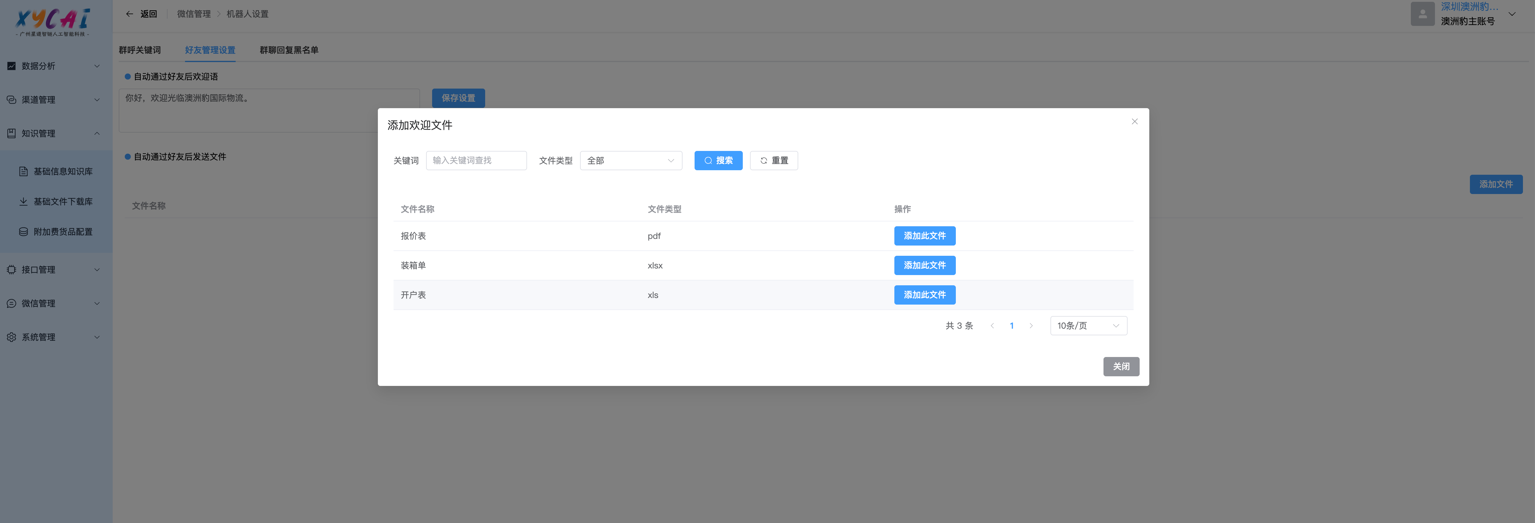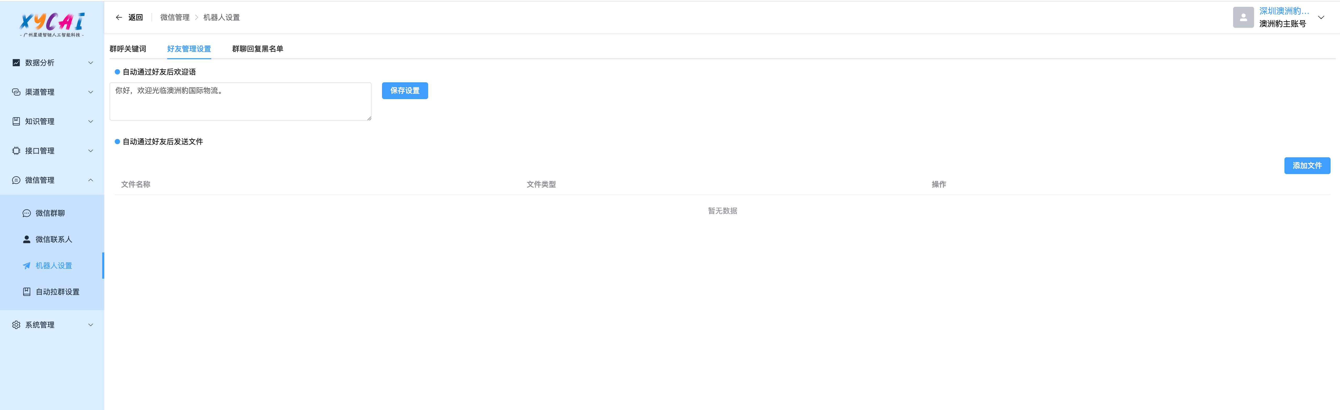 可设置自动通过好友的欢迎语,还可以设置自动通过好友后自动发送文件,文件要在知识管理下的基础文件下载库栏目里面上传后,再到