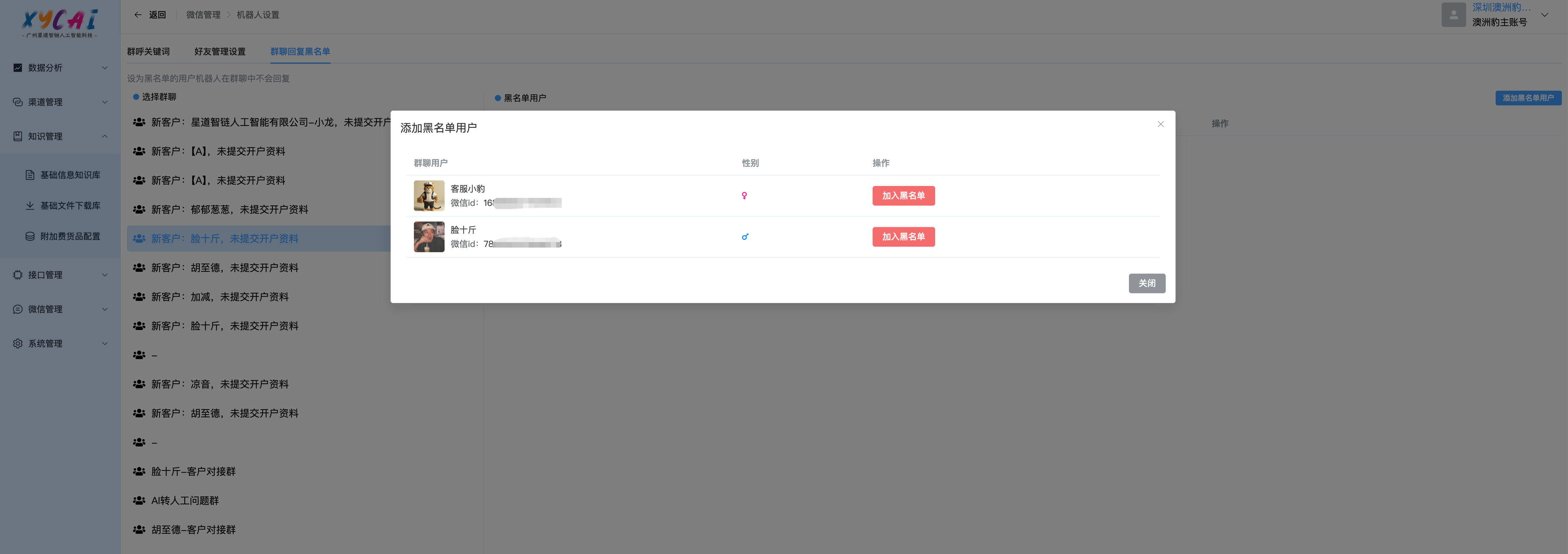 群聊拉黑回复名单 可在群聊里面拉黑一个或者多个人员,拉黑之后,@或者呼叫机器人的时候,机器人不会再回复该人员的问题