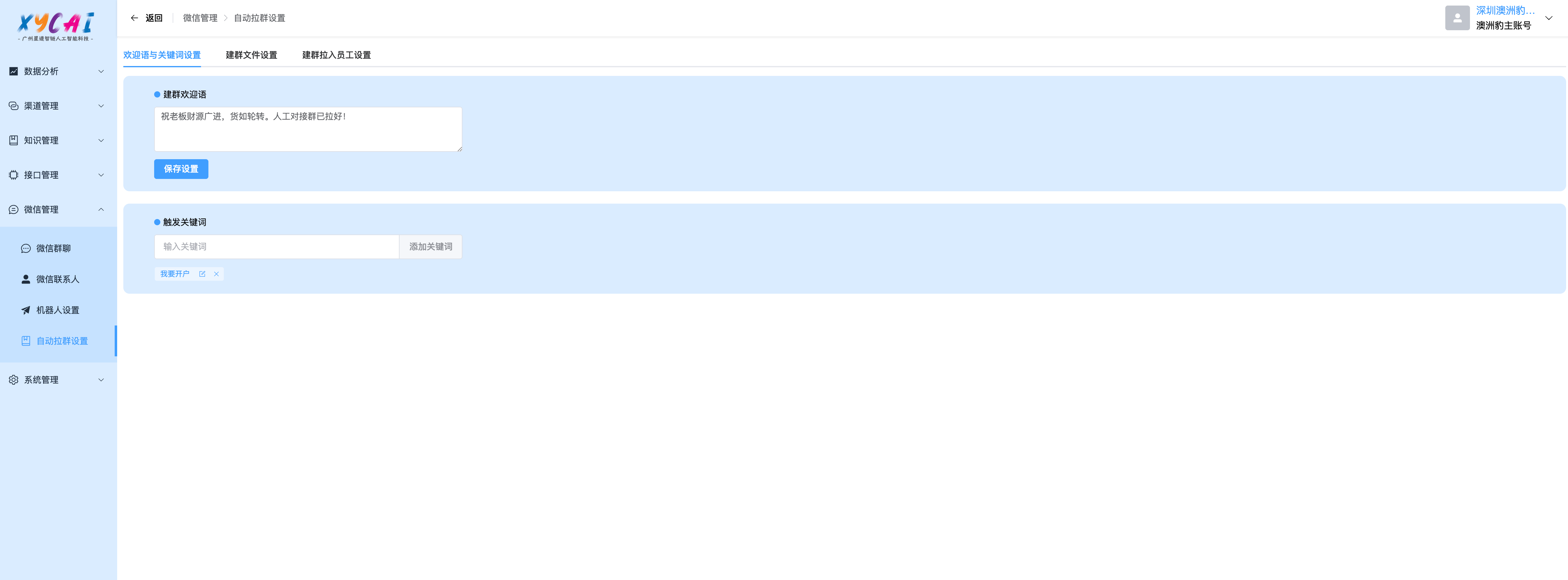 用户在和机器人在私聊发送关键词时,机器人会自动将用户和设置好的客服员工拉群,并且自动发送设置好的欢迎语和文件