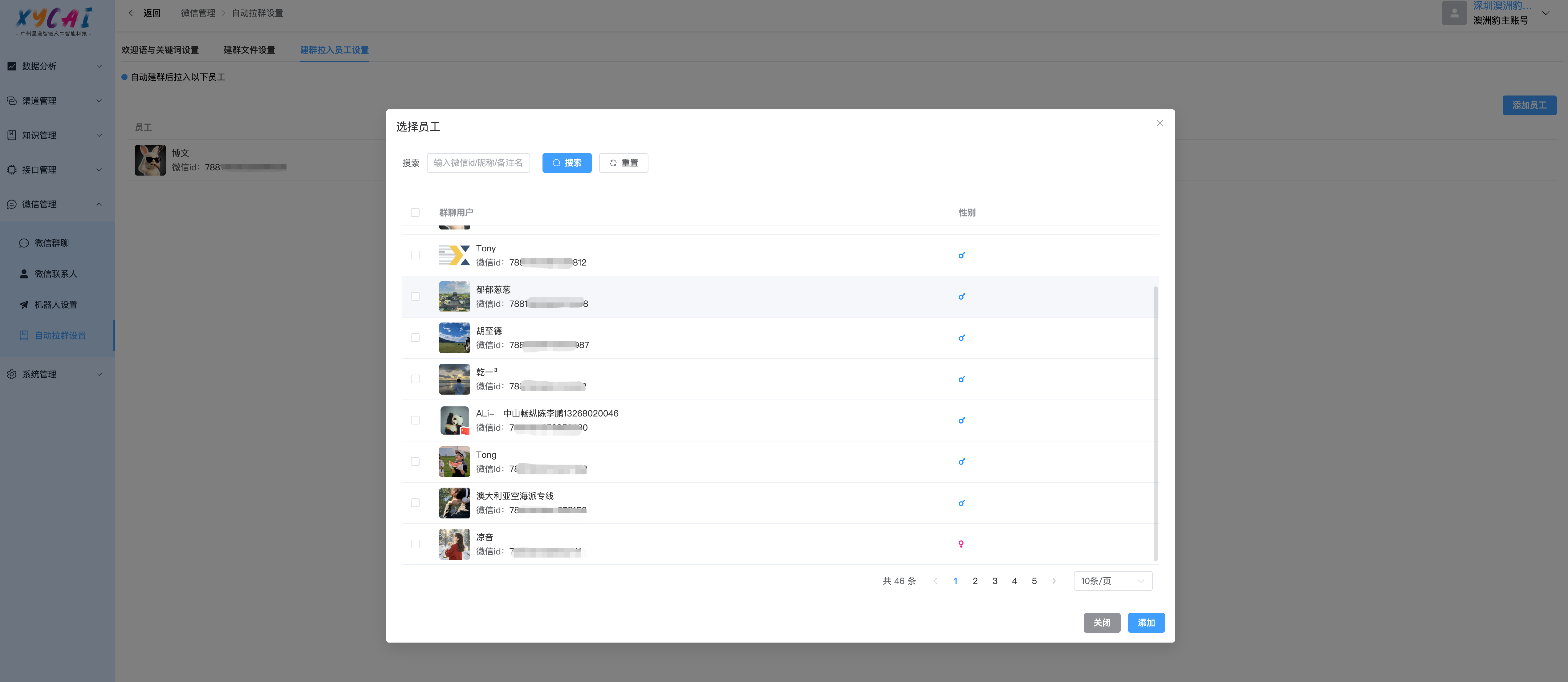 可根据搜索 昵称/备注/微信ID搜索人员,只有可把该员工设置成客服,填完备注名称设置成功客服之后,该微信不会在列表展示了,要